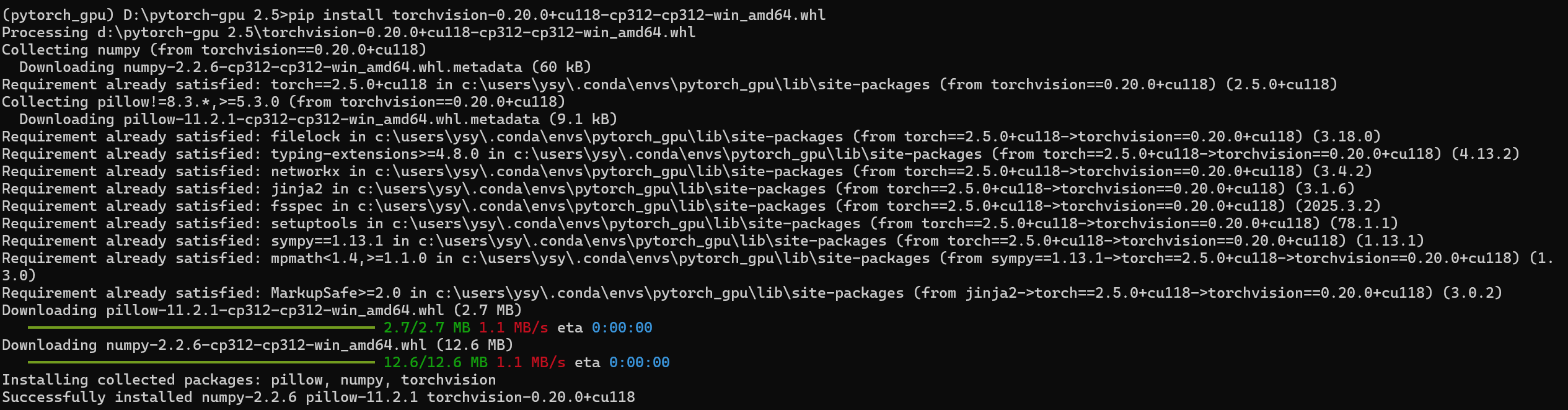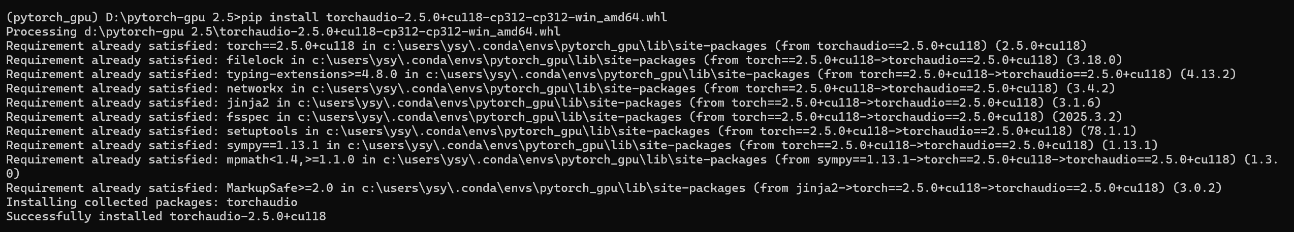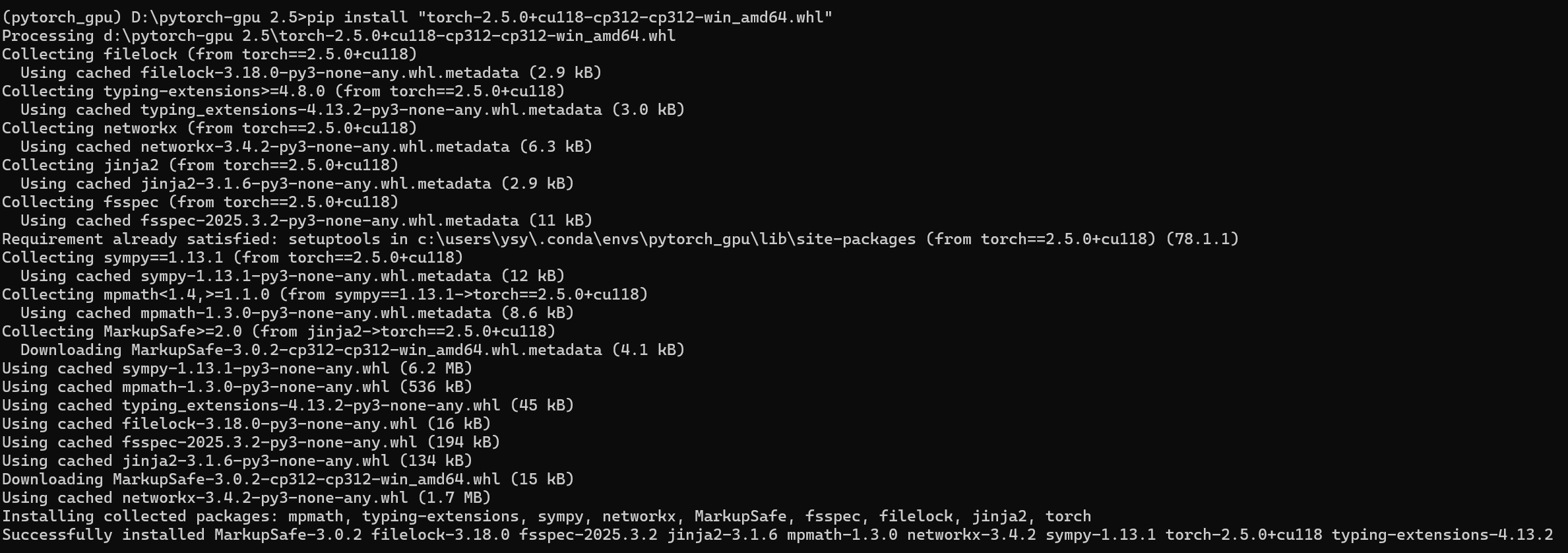 3.将下载好的三个文件新建一个文件夹放入里面,然后再anaconda prompt中切换到含有这三个文件的路径下,执行pip install torch-2.5.0+cu118-cp312-cp312-win_amd64.whl,如图所示