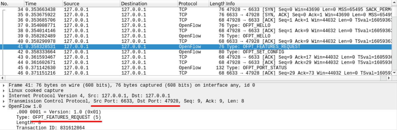 从控制器6633端口到交换机47928端口,使用OpenFlow1.0协议: