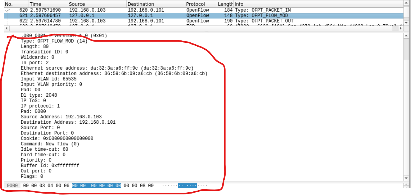 分析抓取的flow_mod数据包,控制器通过6633端口向交换机47928端口、交换机47928端口下发流表项,指导数据的转发处理