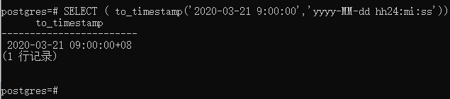 SELECT ( to_timestamp('2020-03-21 9:00:00','yyyy-MM-dd hh24:mi:ss'));