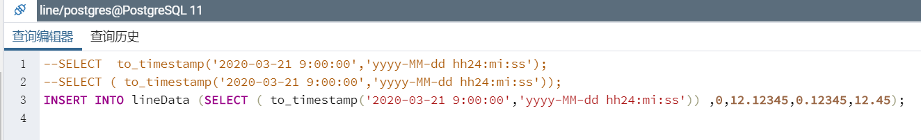 INSERT INTO lineData (SELECT ( to_timestamp('2020-03-21 9:00:01','yyyy-MM-dd hh24:mi:ss')) ,0,12.12345,0.12345,12.45);