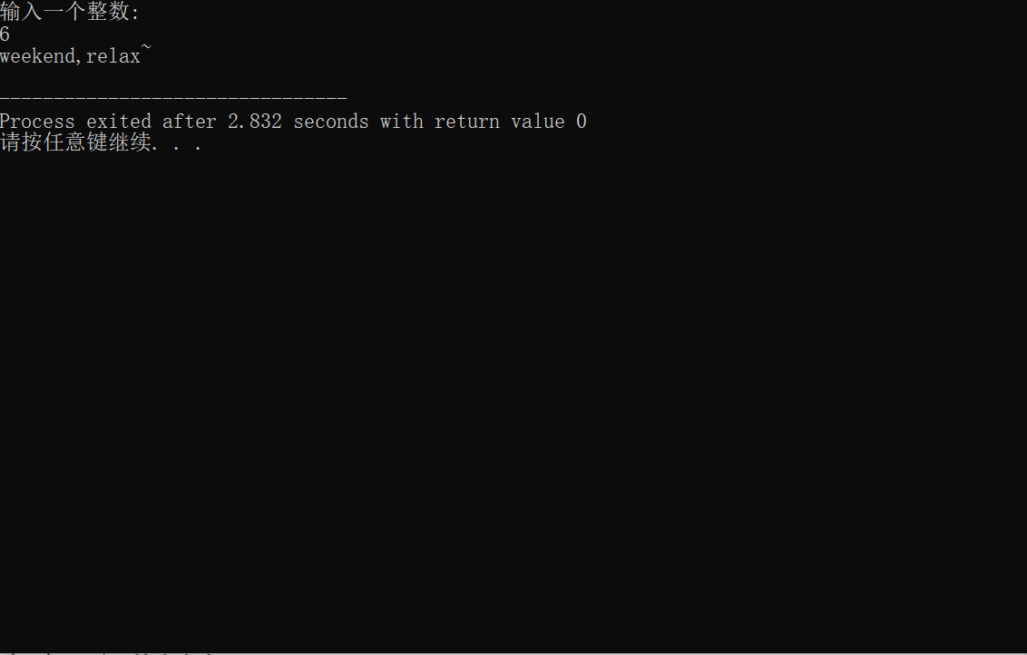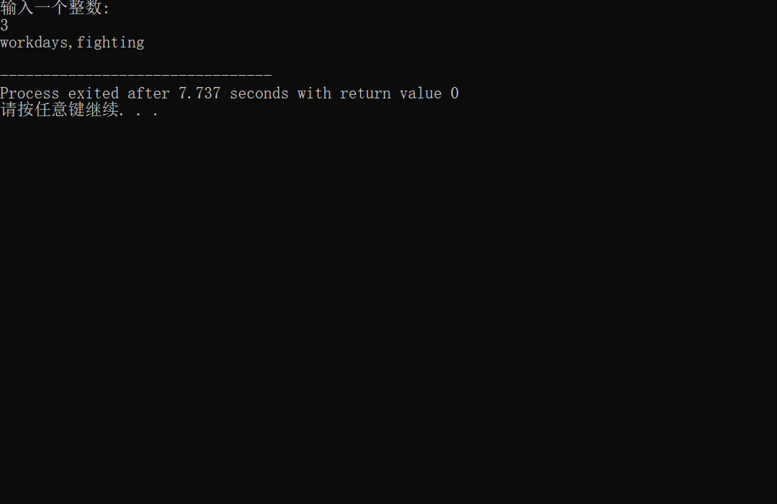 #include <stdio.h> int main() { int days; printf("输入一个整数: \n"); scanf("%d",&days); if(days >= 1 && days <= 5) printf("workdays,fighting\n"); else if(days == 6 || days == 7) printf("weekend,relax~\n"); else printf("Ooops,not in 1~7\n"); return 0; }
