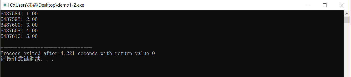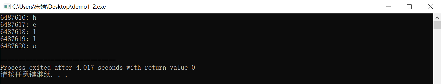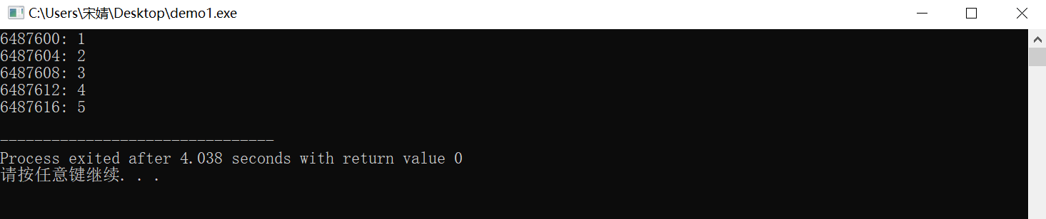 #include <stdio.h> const int N=5; int main() { int a[N] = {1, 2, 3, 4, 5}; int i; for(i=0; i<N; i++) printf("%d: %d\n", &a[i], a[i]); return 0; }