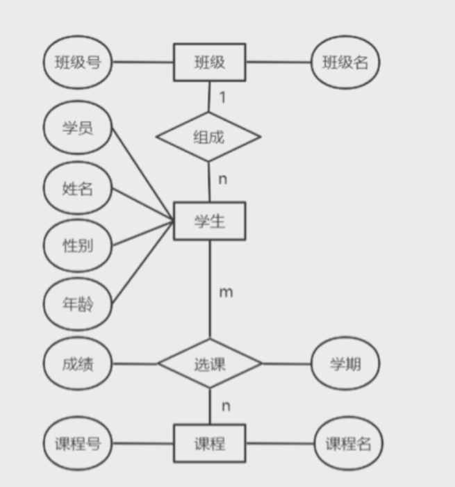 • 实体之间的联系:指不同实体之间联系。例:学生选课实体和学生基本信息实体之间