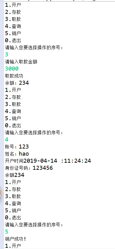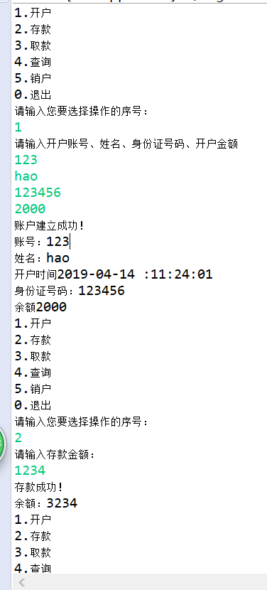 package 实验六; import java.text.SimpleDateFormat; import java.util.Date; import java.util.Scanner; public class Account { String zhanghao; //账号 String xingming; //姓名 String kaihushijian; //开户时间 String shenfenzhenghao; //身份证号 long yue; //余额 Scanner sc=new Scanner (System.in); public void kaihu() { System.out.println("请输入开户账号、姓名、身份证号码、开户金额"); zhanghao=sc.next(); xingming=sc.next(); shenfenzhenghao=sc.next(); yue=sc.nextLong(); System.out.println("账户建立成功!"); }