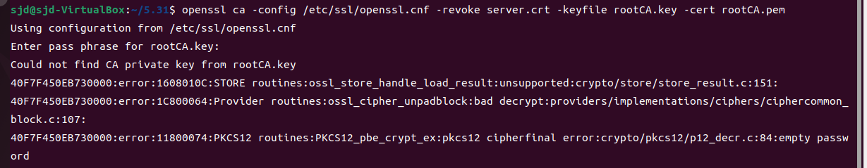 openssl ca -config /etc/ssl/openssl.cnf -revoke server.crt -keyfile rootCA.key -cert rootCA.pem