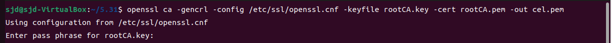 openssl ca -gencrl -config /etc/ssl/openssl.cnf -keyfile rootCA.key -cert rootCA.pem -out crl.pem