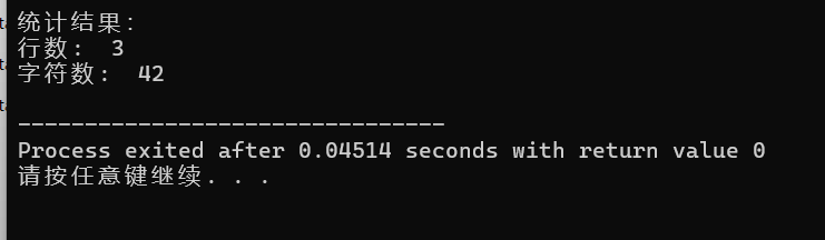 #include <stdio.h> void fun(int *line_Count, int *char_Count) { FILE *fp; fp = fopen("data4.txt", "r"); if (fp == NULL) { printf("无法打开\n"); return; } int t=0; char ch; *line_Count = 0; *char_Count = 0; while ((ch=fgetc(fp))!=EOF) { if (ch=='\n') { (*line_Count)++; t=0; } else if (ch!=' '&&ch!='\n'&&ch!='\t') { (*char_Count)++; t=1; } } if (t) { (*line_Count)++; } fclose(fp); } int main() { int line_Count = 0; int char_Count = 0; fun(&line_Count, &char_Count); printf("统计结果: \n"); printf("行数: %d\n", line_Count); printf("字符数: %d\n", char_Count); return 0; }
