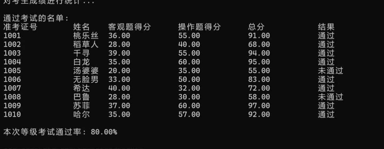 #include <stdio.h> #include <string.h> #define N 10 typedef struct { long id; // 准考证号 char name[20]; // 姓名 float objective; // 客观题得分 float subjective; // 操作题得分 float sum; // 总分 char result[10]; // 考试结果 } STU; // 函数声明 void read(STU st[], int n); void write(STU st[], int n); void output(STU st[], int n); int process(STU st[], int n, STU st_pass[]); int main() { STU stu[N], stu_pass[N]; int cnt; double pass_rate; printf("从文件读入%d个考生信息...\n", N); read(stu, N); printf("\n对考生成绩进行统计...\n"); cnt = process(stu, N, stu_pass); printf("\n通过考试的名单:\n"); output(stu, N); // 输出所有考生完整信息到屏幕 write(stu, N); // 输出考试通过的考生信息到文件 pass_rate = 1.0 * cnt / N; printf("\n本次等级考试通过率: %.2f%%\n", pass_rate*100); return 0; } // 把所有考生完整信息输出到屏幕上 // 准考证号,姓名,客观题得分,操作题得分,总分,结果 void output(STU st[], int n) { int i; printf("准考证号\t姓名\t客观题得分\t操作题得分\t总分\t\t结果\n"); for (i = 0; i < n; i++) printf("%ld\t\t%s\t%.2f\t\t%.2f\t\t%.2f\t\t%s\n", st[i].id, st[i].name, st[i].objective, st[i].subjective, st[i].sum, st[i].result); } // 从文本文件examinee.txt读入考生信息:准考证号,姓名,客观题得分,操作题得分 void read(STU st[], int n) { int i; FILE *fin; fin = fopen("examinee.txt", "r"); if (!fin) { printf("fail to open file\n"); return; } while (!feof(fin)) { for (i = 0; i < n; i++) fscanf(fin, "%ld %s %f %f", &st[i].id, st[i].name, &st[i].objective, &st[i].subjective); } fclose(fin); } // 把通过考试的考生完整信息写入文件list_pass.txt // 准考证号,姓名,客观题得分,操作题得分,总分,结果 void write(STU s[], int n) { int i; FILE *fout; fout = fopen("list_pass.txt", "w"); if (!fout) { perror("fail to open file list_pass.txt"); return; } fprintf(fout, "准考证号\t姓名\t客观题得分\t操作题得分\t总分\t\t结果\n"); for (i = 0; i < n; i++) { if (s[i].sum >= 60) { fprintf(fout, "%ld\t\t%s\t%.2f\t\t%.2f\t\t%.2f\t\t%s\n", s[i].id, s[i].name, s[i].objective, s[i].subjective, s[i].sum, s[i].result); } } fclose(fout); } // 对考生信息进行处理:计算每位考生考试总分、结果;统计考试通过的人数 int process(STU st[], int n, STU st_pass[]) { int i, count = 0; for (i = 0; i < n; i++) { st[i].sum = st[i].objective + st[i].subjective; st[i].sum = (float)((int)(st[i].sum * 100 + 0.5)) / 100; if (st[i].sum >= 60) { strcpy(st[i].result, "通过"); st_pass[count] = st[i]; count++; } else { strcpy(st[i].result, "未通过"); } } return count; }
