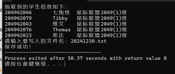 #include <stdio.h> #include <stdlib.h> #include <time.h> #include <string.h> #define M 80 #define N 5 void read(const char *f, char s[M][100]) { FILE *file = fopen(f, "r"); int i = 0; if (file!= NULL) { while (fgets(s[i], 100, file)!= NULL && i < M) { if (s[i][strlen(s[i]) - 1] == '\n') { s[i][strlen(s[i]) - 1] = '\0'; } i++; } fclose(file); } else { printf("无法打开文件 %s\n", f); exit(1); } } void select_stu(const char s[M][100], char sel[N][100]) { int used[M] = {0}; int i; for (i = 0; i < N; i++) { int idx; do { idx = rand() % M; } while (used[idx]); strcpy(sel[i], s[idx]); used[idx] = 1; } } void write_stu(const char sel[N][100], const char *out_f) { FILE *file = fopen(out_f, "w"); int i; if (file!= NULL) { for (i = 0; i < N; i++) { fprintf(file, "%s\n", sel[i]); } fclose(file); } else { printf("无法打开文件 %s\n", out_f); exit(1); } } int main() { char s[M][100]; char sel[N][100]; char out_f[100]; srand(time(NULL)); read("list.txt", s); select_stu(s, sel); printf("抽取到的学生信息如下:\n"); int i; for (i = 0; i < N; i++) { printf("%s\n", sel[i]); } printf("请输入要写入的文件名:"); scanf("%s", out_f); write_stu(sel, out_f); printf("保存成功!"); return 0; }