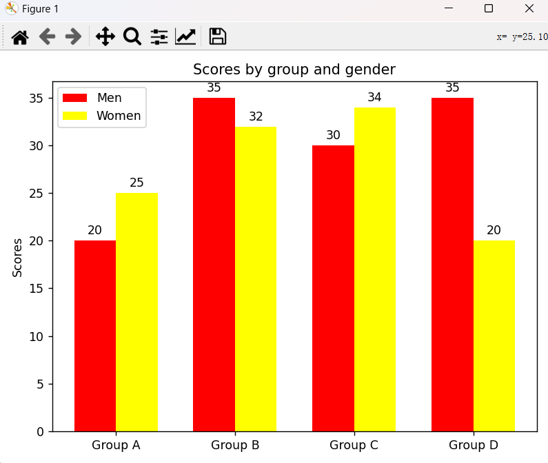 import matplotlib.pyplot as plt import numpy as np # 数据 labels = ['Group A', 'Group B', 'Group C', 'Group D'] men_means = [20, 35, 30, 35,] women_means = [25, 32, 34, 20] # 设置图形参数 x = np.arange(len(labels)) # 标签位置 width = 0.35 # 柱状图宽度 fig, ax = plt.subplots()# 创建图形和坐标轴 # 绘制男性数据的柱状图 rects1 = ax.bar(x - width/2, men_means, width, label='Men', color='red') # 绘制女性数据的柱状图 rects2 = ax.bar(x + width/2, women_means, width, label='Women', color='yellow') # 添加标题和标签 ax.set_ylabel('Scores') ax.set_title('Scores by group and gender') ax.set_xticks(x) ax.set_xticklabels(labels) ax.legend() # 定义添加数据标签的函数 def autolabel(rects): """在每个柱子上添加数据标签""" for rect in rects: height = rect.get_height() ax.annotate('{}'.format(height), xy=(rect.get_x() + rect.get_width() / 2, height), xytext=(0, 3), # 3 points vertical offset textcoords="offset points", ha='center', va='bottom') # 为男性和女性的柱状图添加数据标签 autolabel(rects1) autolabel(rects2) # 显示图形 fig.tight_layout() plt.show()