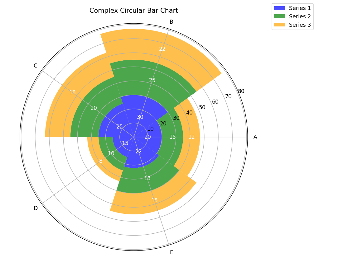 import matplotlib.pyplot as plt import numpy as np # 定义数据 categories = ['A', 'B', 'C', 'D', 'E'] num_categories = len(categories) # 多个数据系列 data_series1 = [20, 30, 25, 15, 22] data_series2 = [15, 25, 20, 10, 18] data_series3 = [12, 22, 18, 8, 15] # 计算每个柱子的角度和宽度 angles = np.linspace(0, 2 * np.pi, num_categories, endpoint=False) width = 2 * np.pi / num_categories # 创建极坐标图 fig, ax = plt.subplots(figsize=(8, 8), subplot_kw={'projection': 'polar'}) # 绘制第一个数据系列 bars1 = ax.bar(angles, data_series1, width=width, bottom=0, label='Series 1', color='blue', alpha=0.7) # 绘制第二个数据系列 bars2 = ax.bar(angles, data_series2, width=width, bottom=data_series1, label='Series 2', color='green', alpha=0.7) # 绘制第三个数据系列 bars3 = ax.bar(angles, data_series3, width=width, bottom=[i + j for i, j in zip(data_series1, data_series2)], label='Series 3', color='orange', alpha=0.7) # 设置坐标轴标签和标题 ax.set_xticks(angles) ax.set_xticklabels(categories) ax.set_title('Complex Circular Bar Chart', pad=20) # 添加图例 ax.legend(loc='upper right', bbox_to_anchor=(1.3, 1.1)) # 显示数据标签 def add_labels(bars, bottom_values, color): for bar, bottom in zip(bars, bottom_values): height = bar.get_height() angle = bar.get_x() + bar.get_width() / 2 value = height ax.text(angle, bottom + height / 2, str(value), ha='center', va='center', color=color, fontsize=10) # 为每个数据系列添加数据标签 add_labels(bars1, [0] * num_categories, 'white') add_labels(bars2, data_series1, 'white') add_labels(bars3, [i + j for i, j in zip(data_series1, data_series2)], 'white') # 显示图形 plt.show()