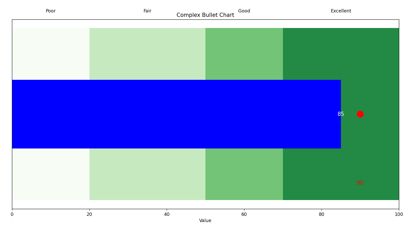 import matplotlib.pyplot as plt import numpy as np # 定义数据 measure = 85 # 实际测量值 markers = [90] # 目标值 ranges = [20, 50, 70, 100] # 不同区间的边界值 labels = ['Poor', 'Fair', 'Good', 'Excellent'] # 区间标签 # 创建图形和坐标轴 fig, ax = plt.subplots(figsize=(10, 2)) # 绘制区间背景 for i in range(len(ranges)): if i == 0: left = 0 else: left = ranges[i - 1] right = ranges[i] color = plt.cm.Greens(i / len(ranges)) # 根据区间设置不同的颜色 ax.barh([0], right - left, left=left, color=color, height=0.5) # 绘制实际测量值柱子 ax.barh([0], measure, color='blue', height=0.2) # 绘制目标值标记 for marker in markers: ax.scatter(marker, 0, color='red', s=200, zorder=10) # 设置坐标轴和标签 ax.set_xlim(0, max(ranges)) ax.set_yticks([]) ax.set_xlabel('Value') ax.set_title('Complex Bullet Chart') # 添加区间标签 for i in range(len(ranges)): if i == 0: mid = ranges[i] / 2 else: mid = (ranges[i - 1] + ranges[i]) / 2 ax.text(mid, 0.3, labels[i], ha='center', va='center', fontsize=10) # 添加数据标签 ax.text(measure, 0, f'{measure}', ha='center', va='center', color='white', fontsize=12) for marker in markers: ax.text(marker, -0.2, f'{marker}', ha='center', va='center', color='red', fontsize=12) plt.show()