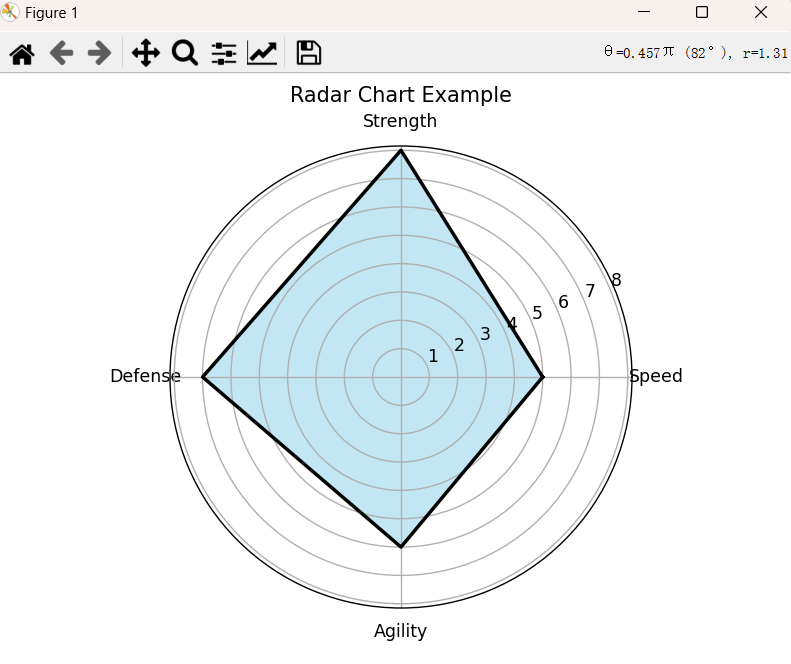 import matplotlib.pyplot as plt import numpy as np labels = ['Speed', 'Strength', 'Defense', 'Agility'] values = [5, 8, 7, 6] angles = np.linspace(0, 2 * np.pi, len(labels), endpoint=False).tolist() values += values[:1] # Close the loop angles += angles[:1] fig, ax = plt.subplots(subplot_kw=dict(polar=True)) ax.fill(angles, values, color='skyblue', alpha=0.5) ax.plot(angles, values, color='black', linewidth=2) ax.set_xticks(angles[:-1]) ax.set_xticklabels(labels) plt.title('Radar Chart Example') plt.show()