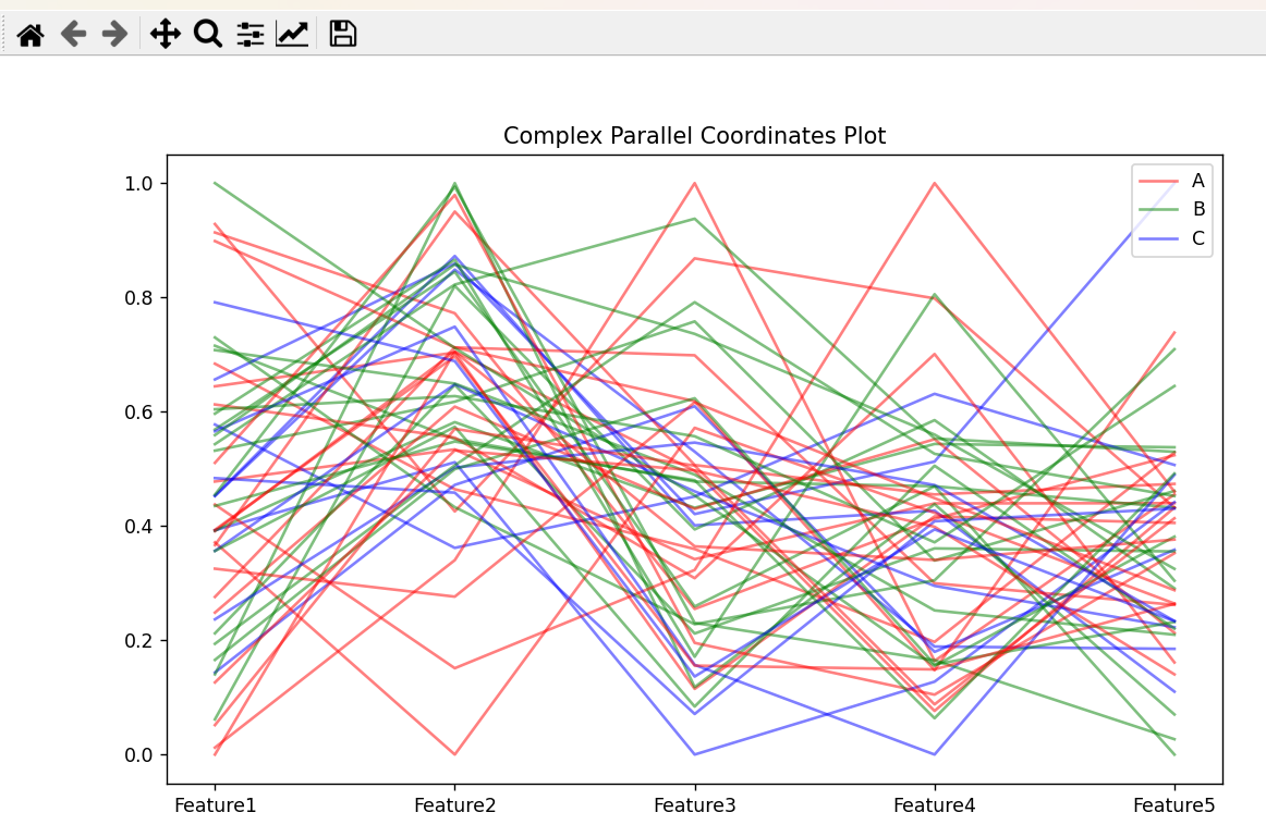 import matplotlib.pyplot as plt import pandas as pd import numpy as np from sklearn.preprocessing import MinMaxScaler # 生成示例数据 np.random.seed(42) n_samples = 50 data = { 'Feature1': np.random.randn(n_samples), 'Feature2': np.random.randn(n_samples) + 2, 'Feature3': np.random.randn(n_samples) - 1, 'Feature4': np.random.randn(n_samples) + 1, 'Feature5': np.random.randn(n_samples) - 2, 'Class': np.random.choice(['A', 'B', 'C'], n_samples) } df = pd.DataFrame(data) # 对数值特征进行归一化处理 scaler = MinMaxScaler() numerical_columns = df.select_dtypes(include=[np.number]).columns df[numerical_columns] = scaler.fit_transform(df[numerical_columns]) # 定义颜色映射 color_map = {'A': 'red', 'B': 'green', 'C': 'blue'} # 创建图形和坐标轴 fig, ax = plt.subplots(figsize=(10, 6)) # 绘制平行坐标图 for index, row in df.iterrows(): class_label = row['Class'] values = row.drop('Class').values x = np.arange(len(values)) ax.plot(x, values, color=color_map[class_label], alpha=0.5) # 设置坐标轴标签 ax.set_xticks(np.arange(len(numerical_columns))) ax.set_xticklabels(numerical_columns) # 添加图例 legend_handles = [] for class_label, color in color_map.items(): line = plt.Line2D([0], [0], color=color, label=class_label, alpha=0.5) legend_handles.append(line) ax.legend(handles=legend_handles, loc='upper right') # 设置标题 ax.set_title('Complex Parallel Coordinates Plot') # 显示图形 plt.show()