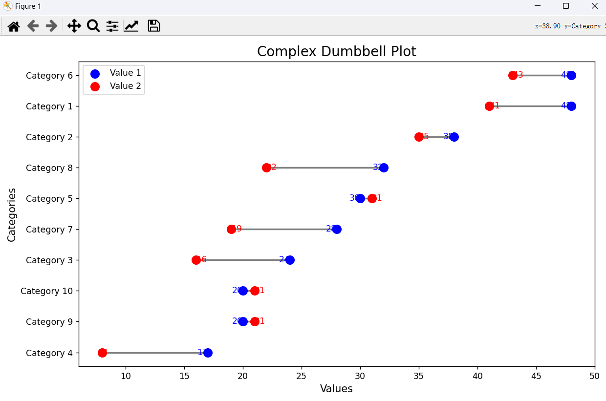 import matplotlib.pyplot as plt import pandas as pd import numpy as np # 生成示例数据 np.random.seed(42) categories = [f'Category {i}' for i in range(1, 11)] value1 = np.random.randint(10, 50, 10) value2 = value1 + np.random.randint(-10, 10, 10) data = { 'Category': categories, 'Value1': value1, 'Value2': value2 } df = pd.DataFrame(data) # 按 Value1 排序 df = df.sort_values(by='Value1') # 绘制哑铃图 plt.figure(figsize=(10, 6)) # 绘制线段 for i, row in df.iterrows(): plt.hlines(y=row['Category'], xmin=row['Value1'], xmax=row['Value2'], color='gray', linewidth=2) # 绘制起始点 plt.scatter(df['Value1'], df['Category'], color='blue', s=100, label='Value 1', zorder=2) # 绘制结束点 plt.scatter(df['Value2'], df['Category'], color='red', s=100, label='Value 2', zorder=2) # 添加数据标签 for i, row in df.iterrows(): plt.text(row['Value1'], row['Category'], str(row['Value1']), ha='right', va='center', fontsize=10, color='blue') plt.text(row['Value2'], row['Category'], str(row['Value2']), ha='left', va='center', fontsize=10, color='red') # 添加标题和标签 plt.title('Complex Dumbbell Plot', fontsize=16) plt.xlabel('Values', fontsize=12) plt.ylabel('Categories', fontsize=12) # 添加图例 plt.legend() # 调整布局 plt.tight_layout() # 显示图形 plt.show()