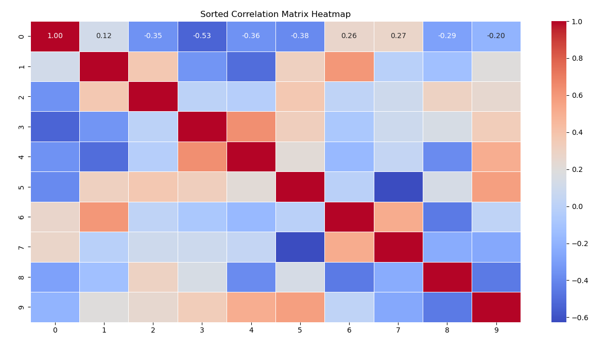 import numpy as np import pandas as pd import seaborn as sns import matplotlib.pyplot as plt # 生成随机数据 np.random.seed(0) data = np.random.rand(10, 10) # 生成10x10的随机矩阵 # 计算相关性矩阵 corr_matrix = np.corrcoef(data) # 对相关性矩阵进行排序 # 使用谱聚类方法对行和列进行排序 from sklearn.cluster import SpectralClustering # 谱聚类 sc = SpectralClustering(n_clusters=3, affinity='nearest_neighbors', random_state=0) clusters = sc.fit_predict(corr_matrix) # 按照聚类结果对行和列进行排序 sorted_indices = np.argsort(clusters) sorted_corr_matrix = corr_matrix[sorted_indices, :][:, sorted_indices] # 绘制热力图 plt.figure(figsize=(10, 8)) sns.heatmap(sorted_corr_matrix, annot=True, cmap='coolwarm', fmt=".2f", linewidths=.5) plt.title('Sorted Correlation Matrix Heatmap') plt.show()