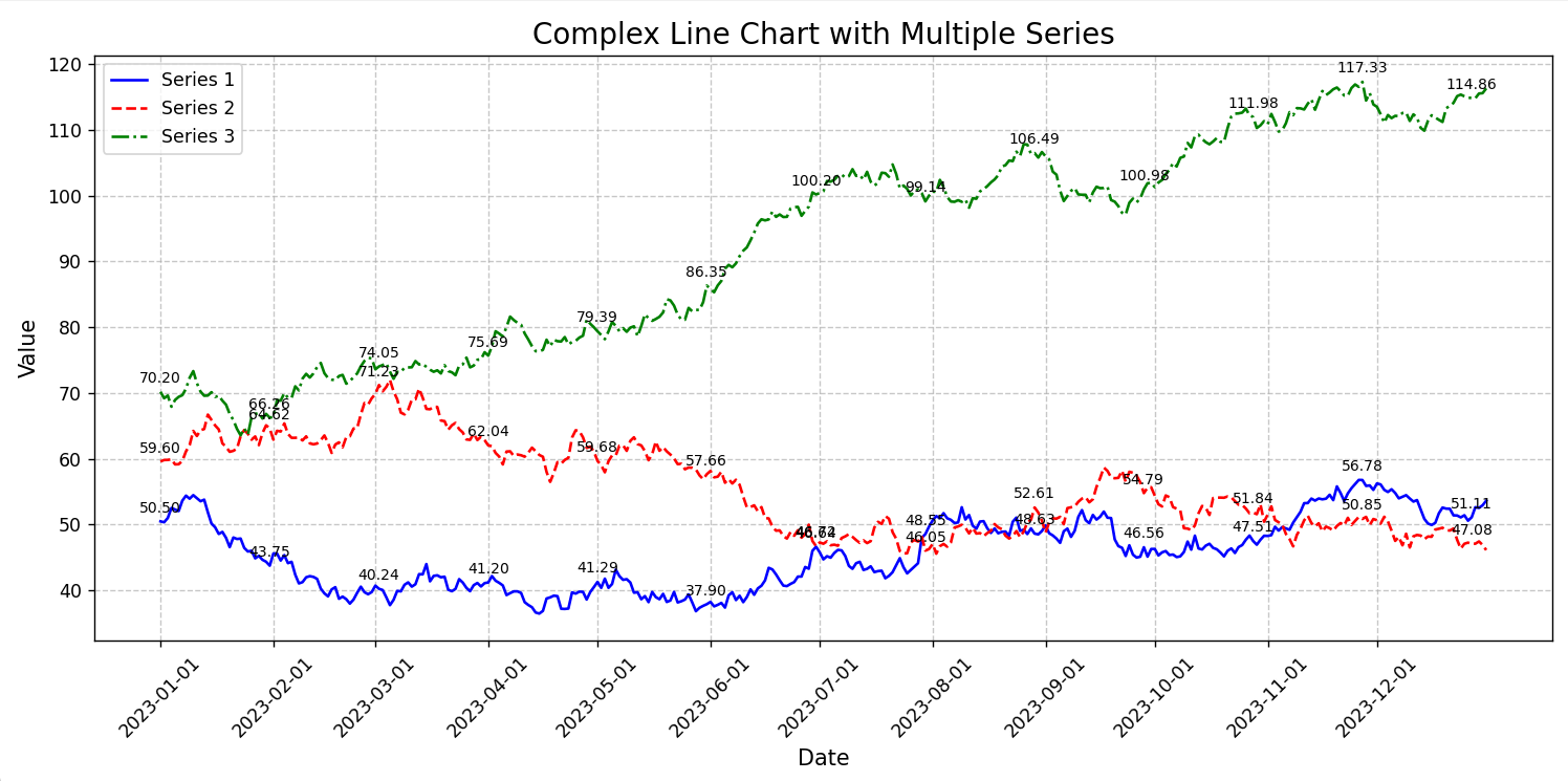 import matplotlib.pyplot as plt import numpy as np import pandas as pd # 生成示例数据 np.random.seed(42) date_rng = pd.date_range(start='2023-01-01', end='2023-12-31', freq='D') data1 = np.random.randn(len(date_rng)).cumsum() + 50 data2 = np.random.randn(len(date_rng)).cumsum() + 60 data3 = np.random.randn(len(date_rng)).cumsum() + 70 # 创建 DataFrame df = pd.DataFrame({'date': date_rng, 'Series 1': data1, 'Series 2': data2, 'Series 3': data3}) # 设置图形大小 plt.figure(figsize=(12, 6)) # 绘制三条折线图 plt.plot(df['date'], df['Series 1'], label='Series 1', color='blue', linestyle='-', linewidth=1.5) plt.plot(df['date'], df['Series 2'], label='Series 2', color='red', linestyle='--', linewidth=1.5) plt.plot(df['date'], df['Series 3'], label='Series 3', color='green', linestyle='-.', linewidth=1.5) # 添加标题和标签 plt.title('Complex Line Chart with Multiple Series', fontsize=16) plt.xlabel('Date', fontsize=12) plt.ylabel('Value', fontsize=12) # 设置 x 轴刻度间隔为每月 plt.xticks(pd.date_range(start='2023-01-01', end='2023-12-31', freq='MS'), rotation=45) # 添加网格线 plt.grid(True, linestyle='--', alpha=0.7) # 添加图例 plt.legend(loc='upper left', fontsize=10) # 添加数据标签(每隔 30 天) for i in range(0, len(df), 30): plt.annotate(f'{df["Series 1"][i]:.2f}', (df['date'][i], df['Series 1'][i]), textcoords='offset points', xytext=(0, 5), ha='center', fontsize=8) plt.annotate(f'{df["Series 2"][i]:.2f}', (df['date'][i], df['Series 2'][i]), textcoords='offset points', xytext=(0, 5), ha='center', fontsize=8) plt.annotate(f'{df["Series 3"][i]:.2f}', (df['date'][i], df['Series 3'][i]), textcoords='offset points', xytext=(0, 5), ha='center', fontsize=8) # 显示图形 plt.tight_layout() plt.show()