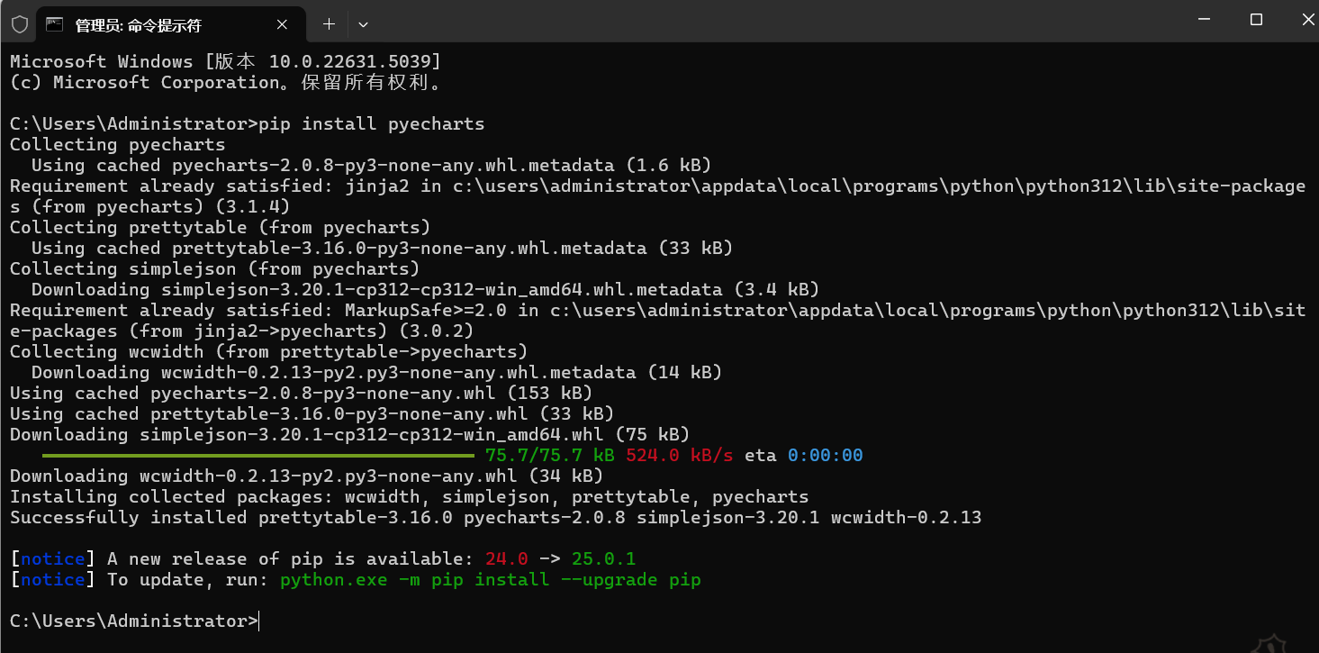 2. 打开cmd ,安装Python所需要的第三方的包,输入pip install pyecharts