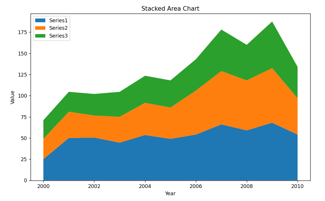 堆叠面积图(Stacked Area Chart):图像展示了从2000年到2010年三个数据系列(Series1、Series2、Series3)的变化情况。每个系列用不同的颜色表示:Series1为蓝色,Series2为橙色,Series3为绿色。图像的纵轴表示数值(Value),横轴表示年份(Year)。