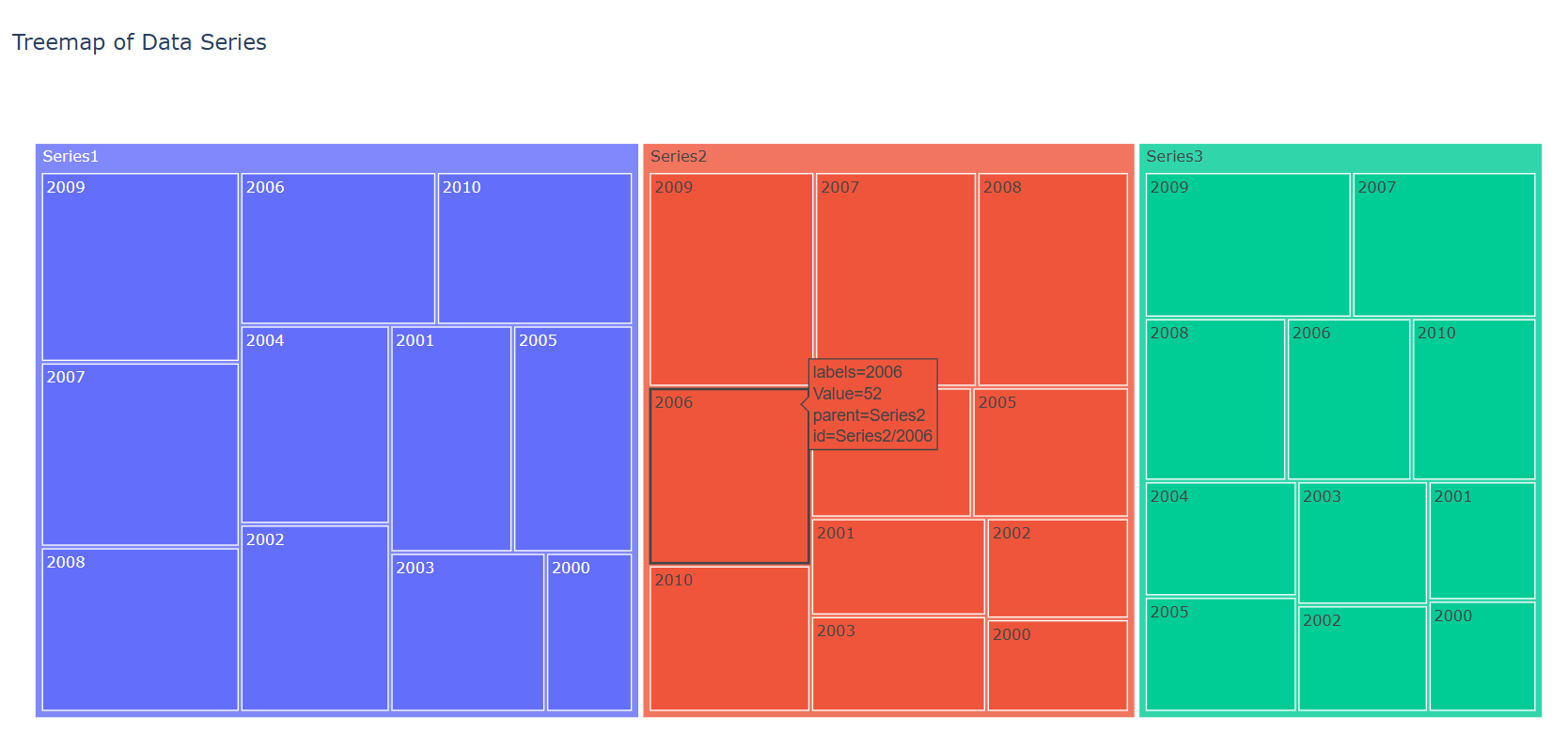 矩形树图(Treemap):图像展示了三个数据系列(Series1、Series2、Series3)在不同年份的数值分布。每个系列用不同的颜色表示:Series1为蓝色,Series2为红色,Series3为绿色。每个矩形的大小表示对应年份的数值大小,矩形内的标签显示年份。随着鼠标的移动,就会显示出相关的信息。