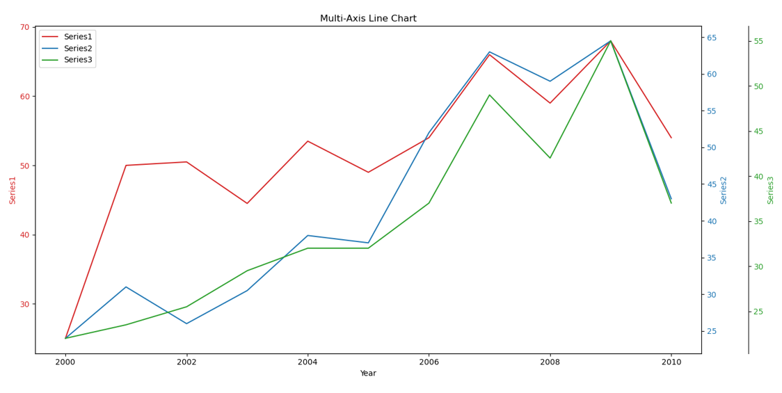 多轴折线图(Multi-Axis Line Chart):图像展示了从2000年到2010年三个数据系列(Series1、Series2、Series3)的变化情况。每个系列用不同的颜色表示:Series1为红色,Series2为蓝色,Series3为绿色。图像的纵轴表示数值(Series1和Series3共用左侧纵轴,Series2使用右侧纵轴),横轴表示年份(Year)。多轴折线图适合展示多个数据系列随时间的变化趋势,特别是当这些系列的数值范围差异较大时。通过使用多个 y 轴,可以更清晰地展示每个系列的变化情况,避免数值范围差异导致的可视化问题。图像中的图例帮助区分不同的数据系列,颜色编码使得每个系列的变化趋势更加直观。这种图表类型在数据分析和报告中非常有用,因为它可以同时展示多个相关数据系列的变化趋势,便于比较和分析。