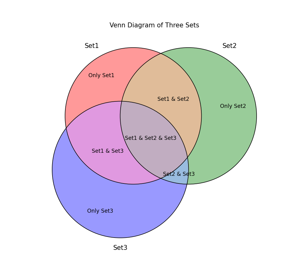 1 import matplotlib.pyplot as plt 2 from matplotlib_venn import venn3, venn3_circles 3 4 # 定义三个集合 5 set1 = {'A', 'B', 'C', 'D'} 6 set2 = {'B', 'C', 'E', 'F'} 7 set3 = {'A', 'C', 'G', 'H'} 8 9 # 绘制维恩图 10 fig, ax = plt.subplots() 11 venn = venn3([set1, set2, set3], ('Set1', 'Set2', 'Set3'), ax=ax) 12 13 # 添加集合标签 14 venn.get_label_by_id('100').set_text('Only Set1') 15 venn.get_label_by_id('010').set_text('Only Set2') 16 venn.get_label_by_id('001').set_text('Only Set3') 17 venn.get_label_by_id('110').set_text('Set1 & Set2') 18 venn.get_label_by_id('011').set_text('Set2 & Set3') 19 venn.get_label_by_id('101').set_text('Set1 & Set3') 20 venn.get_label_by_id('111').set_text('Set1 & Set2 & Set3') 21 22 # 绘制圆圈(可选,用于更清晰地显示边界) 23 c = venn3_circles([set1, set2, set3], ax=ax, linewidth=1, color='black') 24 25 # 显示图形 26 plt.title('Venn Diagram of Three Sets') 27 plt.show()