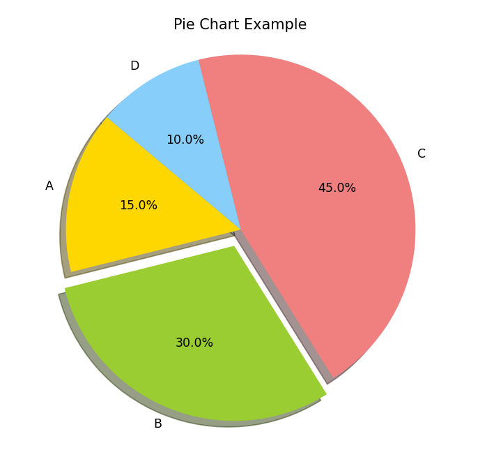 1 import matplotlib.pyplot as plt 2 3 # 数据 4 labels = 'A', 'B', 'C', 'D' 5 sizes = [15, 30, 45, 10] 6 colors = ['gold', 'yellowgreen', 'lightcoral', 'lightskyblue'] 7 explode = (0, 0.1, 0, 0) # 突出显示第二个扇形 8 9 # 绘制饼图 10 plt.figure(figsize=(8, 6)) 11 plt.pie(sizes, explode=explode, labels=labels, colors=colors, 12 autopct='%1.1f%%', shadow=True, startangle=140) 13 14 # 确保饼图是圆的 15 plt.axis('equal') 16 17 # 添加标题 18 plt.title('Pie Chart Example') 19 20 # 显示图形 21 plt.show()