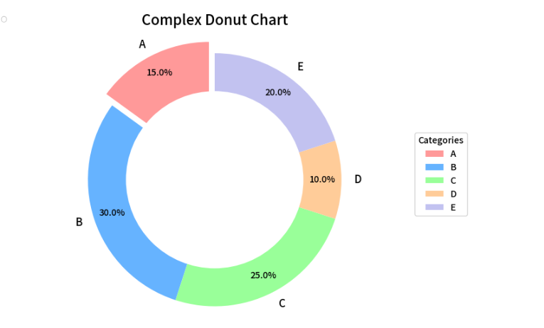 import matplotlib.pyplot as plt import numpy as np # 数据 labels = ['A', 'B', 'C', 'D', 'E'] sizes = [15, 30, 25, 10, 20] colors = ['#ff9999', '#66b3ff', '#99ff99', '#ffcc99', '#c2c2f0'] explode = (0.1, 0, 0, 0, 0) # 突出显示第一个部分 # 创建一个图形和坐标轴 fig, ax = plt.subplots() # 绘制饼图 wedges, texts, autotexts = ax.pie(sizes, explode=explode, labels=labels, colors=colors, autopct='%1.1f%%', startangle=90, pctdistance=0.85) # 绘制白色圆形以创建环形图 centre_circle = plt.Circle((0, 0), 0.70, fc='white') fig.gca().add_artist(centre_circle) # 设置图形为等比例缩放,确保饼图是圆形 ax.axis('equal') plt.tight_layout() # 自定义文本属性 for text in texts: text.set_color('black') text.set_fontsize(12) for autotext in autotexts: autotext.set_color('black') autotext.set_fontsize(10) # 添加图例 ax.legend(wedges, labels, title="Categories", loc="center left", bbox_to_anchor=(1, 0, 0.5, 1)) # 添加标题 plt.title("Complex Donut Chart", fontsize=16) # 显示图形 plt.show()