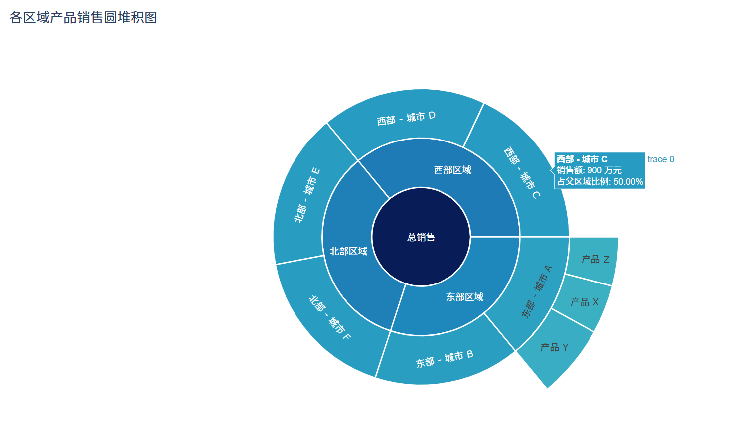 | 圆堆积图 | 多层级展示,视觉对比明显 | 可同时展示多个层级的数据关系,便于视觉对比 | 数据层级过多时,图形复杂,难以清晰展示 | 销售数据分析、市场份额分析、资源分配展示 |