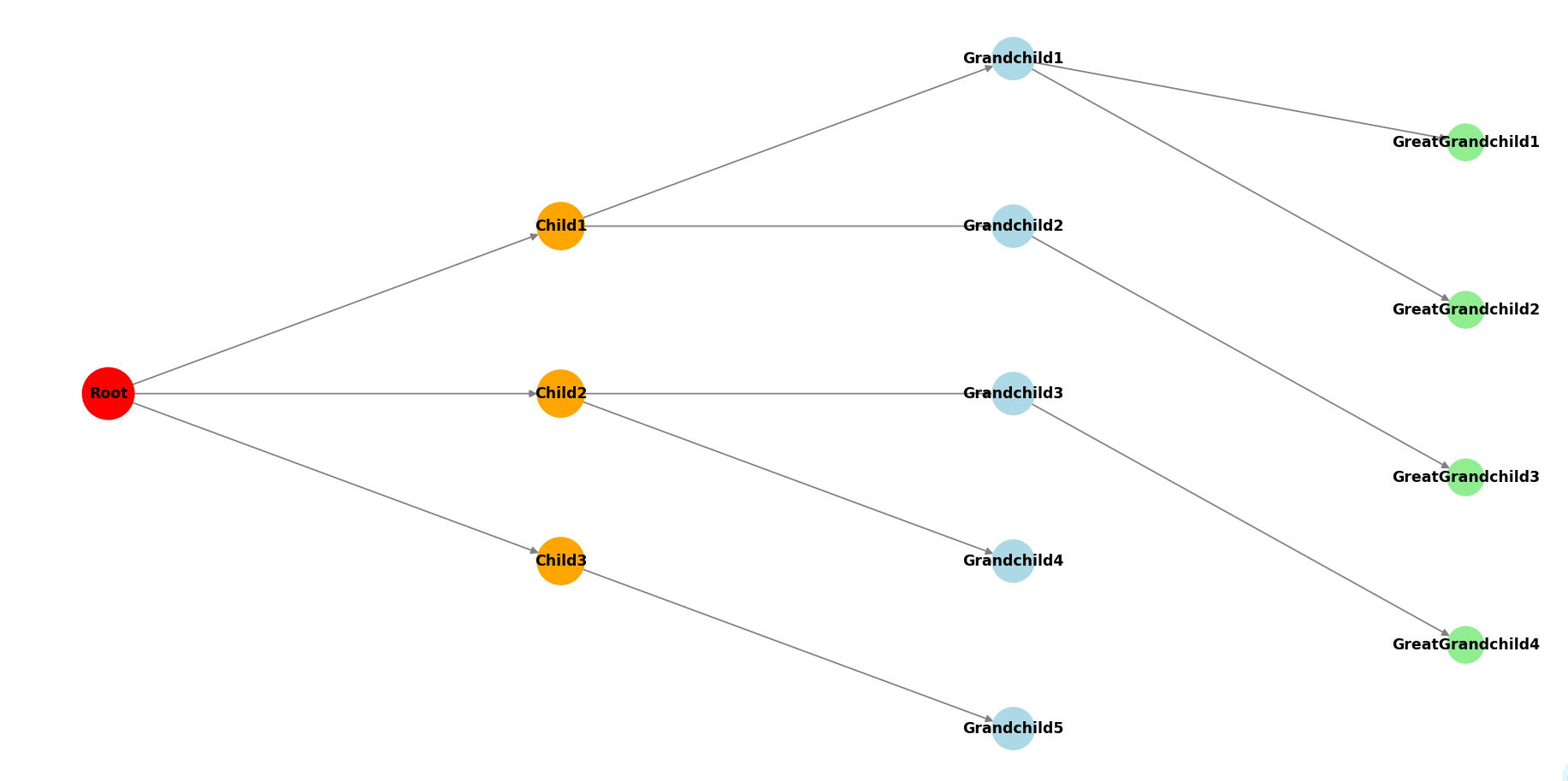 import matplotlib.pyplot as plt import networkx as nx def draw_complex_tree(): # 创建一个有向图 G = nx.DiGraph() # 定义一个复杂的树结构 nodes = { "Root": ["Child1", "Child2", "Child3"], "Child1": ["Grandchild1", "Grandchild2"], "Child2": ["Grandchild3", "Grandchild4"], "Child3": ["Grandchild5"], "Grandchild1": ["GreatGrandchild1", "GreatGrandchild2"], "Grandchild2": ["GreatGrandchild3"], "Grandchild3": ["GreatGrandchild4"], "Grandchild4": [], "Grandchild5": [] } # 定义节点的层级(用于布局和颜色区分) levels = { "Root": 0, "Child1": 1, "Child2": 1, "Child3": 1, "Grandchild1": 2, "Grandchild2": 2, "Grandchild3": 2, "Grandchild4": 2, "Grandchild5": 2, "GreatGrandchild1": 3, "GreatGrandchild2": 3, "GreatGrandchild3": 3, "GreatGrandchild4": 3 } # 添加节点和边,并将层级信息作为节点属性存储 for parent, children in nodes.items(): G.add_node(parent, level=levels[parent]) # 添加父节点及其层级 for child in children: G.add_node(child, level=levels[child]) # 添加子节点及其层级 G.add_edge(parent, child) # 添加边 # 设置布局(分层布局) pos = nx.multipartite_layout(G, subset_key="level", align="vertical") # 设置节点颜色和大小 node_colors = [] node_sizes = [] for node in G.nodes(): level = G.nodes[node]['level'] # 从节点属性中获取层级 if level == 0: node_colors.append("red") # 根节点为红色 node_sizes.append(1200) elif level == 1: node_colors.append("orange") # 第一层为橙色 node_sizes.append(1000) elif level == 2: node_colors.append("lightblue") # 第二层为浅蓝色 node_sizes.append(800) else: node_colors.append("lightgreen") # 第三层为浅绿色 node_sizes.append(600) # 绘制图形 plt.figure(figsize=(12, 8)) nx.draw(G, pos, with_labels=True, node_size=node_sizes, node_color=node_colors, font_size=10, font_weight="bold", arrows=True, edge_color="gray") plt.title("Complex Tree Diagram", fontsize=16) plt.show() if __name__ == "__main__": draw_complex_tree()