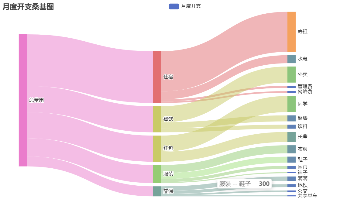 from pyecharts import options as opts from pyecharts.charts import Sankey # 定义节点和连接 nodes = [ {"name": "总费用"}, {"name": "住宿"}, {"name": "餐饮"}, {"name": "交通"}, {"name": "服装"}, {"name": "红包"}, {"name": "房租"}, {"name": "水电"}, {"name": "管理费"}, {"name": "网络费"}, {"name": "外卖"}, {"name": "聚餐"}, {"name": "饮料"}, {"name": "滴滴"}, {"name": "地铁"}, {"name": "公交"}, {"name": "共享单车"}, {"name": "衣服"}, {"name": "鞋子"}, {"name": "围巾"}, {"name": "袜子"}, {"name": "同学"}, {"name": "长辈"}, ] links = [ {"source": "总费用", "target": "住宿", "value": 2580}, {"source": "总费用", "target": "餐饮", "value": 1300}, {"source": "总费用", "target": "交通", "value": 500}, {"source": "总费用", "target": "服装", "value": 900}, {"source": "总费用", "target": "红包", "value": 1300}, {"source": "住宿", "target": "房租", "value": 2000}, {"source": "住宿", "target": "水电", "value": 400}, {"source": "住宿", "target": "管理费", "value": 100}, {"source": "住宿", "target": "网络费", "value": 80}, {"source": "餐饮", "target": "外卖", "value": 800}, {"source": "餐饮", "target": "聚餐", "value": 300}, {"source": "餐饮", "target": "饮料", "value": 200}, {"source": "交通", "target": "滴滴", "value": 220}, {"source": "交通", "target": "地铁", "value": 150}, {"source": "交通", "target": "公交", "value": 80}, {"source": "交通", "target": "共享单车", "value": 50}, {"source": "服装", "target": "衣服", "value": 400}, {"source": "服装", "target": "鞋子", "value": 300}, {"source": "服装", "target": "围巾", "value": 150}, {"source": "服装", "target": "袜子", "value": 50}, {"source": "红包", "target": "同学", "value": 800}, {"source": "红包", "target": "长辈", "value": 500}, ] # 创建桑基图 sankey = ( Sankey() .add( "月度开支", nodes, links, linestyle_opt=opts.LineStyleOpts(opacity=0.5, curve=0.5, color="source"), label_opts=opts.LabelOpts(position="right"), ) .set_global_opts(title_opts=opts.TitleOpts(title="月度开支桑基图")) ) # 渲染为HTML文件并显示 sankey.render("C:/Users/Administrator/Desktop/sankey_complex_example.html")