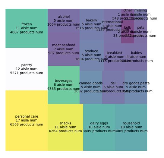 cmap = matplotlib.cm.viridis mini,maxi = temp2.products_department.min(),temp2.products_department.max() norm = matplotlib.colors.Normalize(vmin=mini,vmax=maxi) colors = [cmap(norm(value)) for value in temp2.products_department] colors[1] = "#FBFCFE" labels = ["%s\n%d aisle num\n%d products num"% (label) for label in zip(temp2.index,temp2.aisle_department,temp2.products_department)] fig = plt.figure(figsize=(20,16)) ax = fig.add_subplot(111,aspect="equal") ax = squarify.plot(temp2.aisle_department, color=colors, label=labels, ax=ax, alpha=.7)