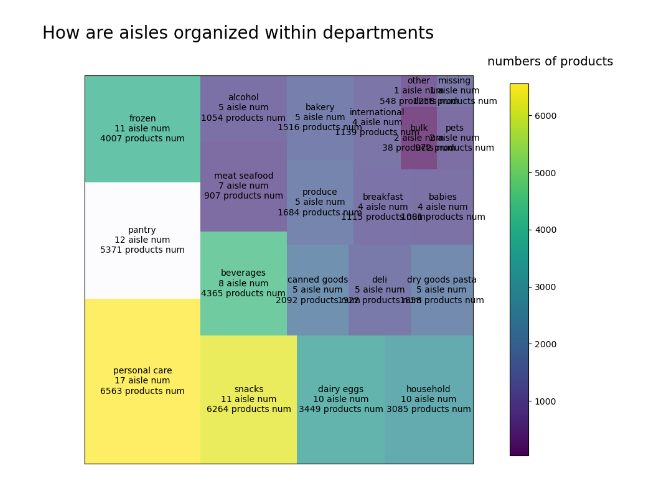 1 img = plt.imshow([temp.products_department],camp=camp) 2 img.set_visible(False) 3 fig.colorbar(img,orientation="vertical",shrink=.96) 4 fig.text(.76,.9,"numbers of products",fontsize=14)