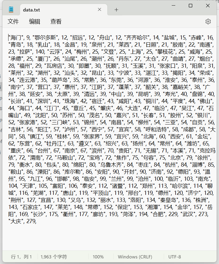 下载数据文件(data.txt),该文件表示了一些城市某天的空 气质量指数(AQI)。