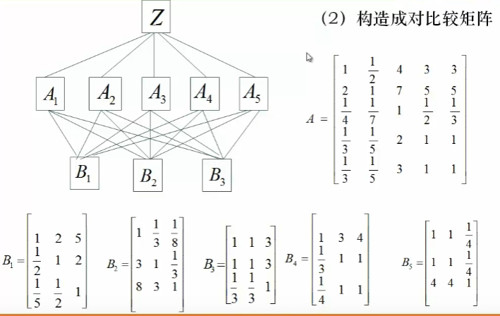 比较第 i 个元素与第 j 个元素相对上一层某个因素的重要性时,使用数量化的相对权重aij来描述。设共有 n 个元素参与比较,则称为成对比较矩阵。