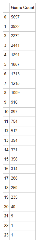 然后,我们对一些行或列,使用聚合函数如 sum 进行分析,看看哪个流派出现的频次是最高的?