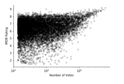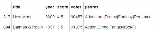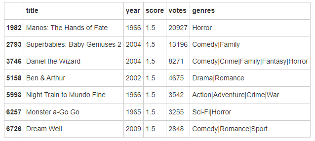 在这个过程中,我们寻找到了一些异常点,比如:评价较低但是投票数高。