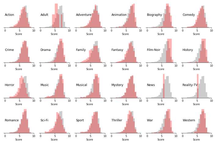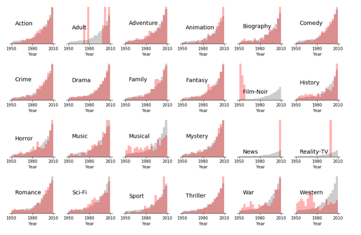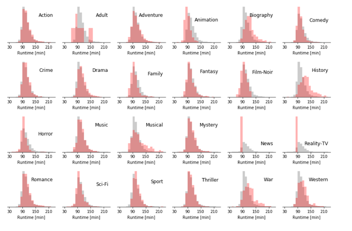 接下来我们按照流派划分数据,看看发行时间,时长,评分是如何分布的。 全部电影数据的分布作为灰色背景展示。