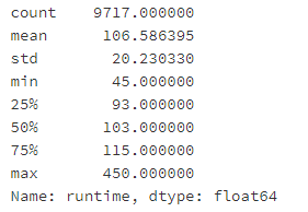 在此过程中,我们发现电影时长有一部分为0的,来看看一共有多少,顺手标记为NAN将损坏的数据 标记完成后再看一下。