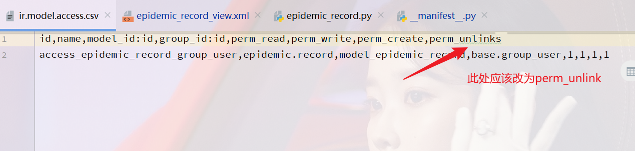 - 首先我写好了模型,根据模型写好视图,第三步配置好权限,并且在__manifes__.py文件中引用模型,但是在安装好模块升级的过程中,却遇到了一个问题,系统报错提示信息为perm_unlinks