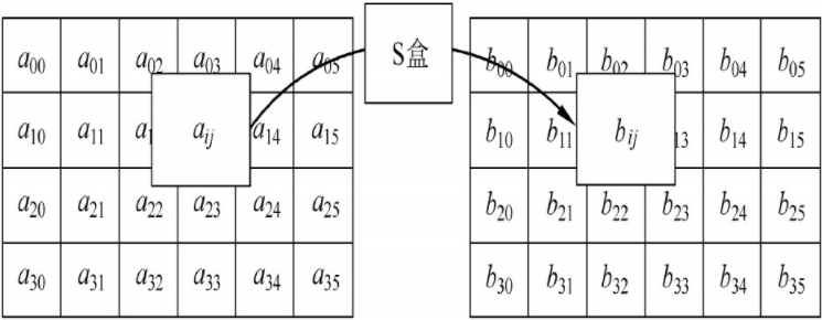 字节代换是非线形变换,独立地对状态的每个字节进行,代换表(即S-盒)是可逆的8比特输入,到8比特输出。