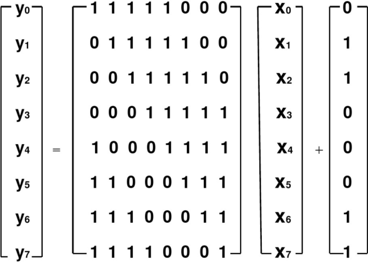 最后,对字节做如下的(GF(2)上的,可逆的)仿射变换:
