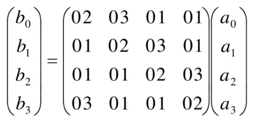 列混合变换中,将状态阵列的每列视为(GF(28)4)上的多项式,再与ー个固定的多项式c(x)进行模x4+1乘法