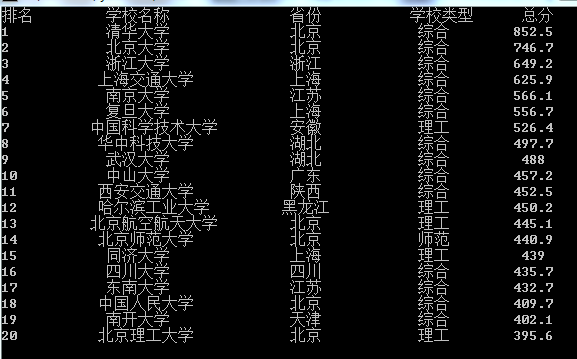 print("{0:<5}\t{1:^15}\t{2:^10}\t{3:^10}\t{4:^5}".format('排名', '学校名称','省份','学校类型', '总分'))