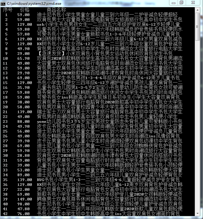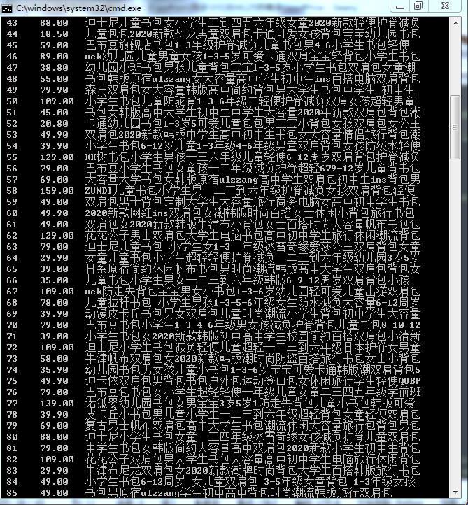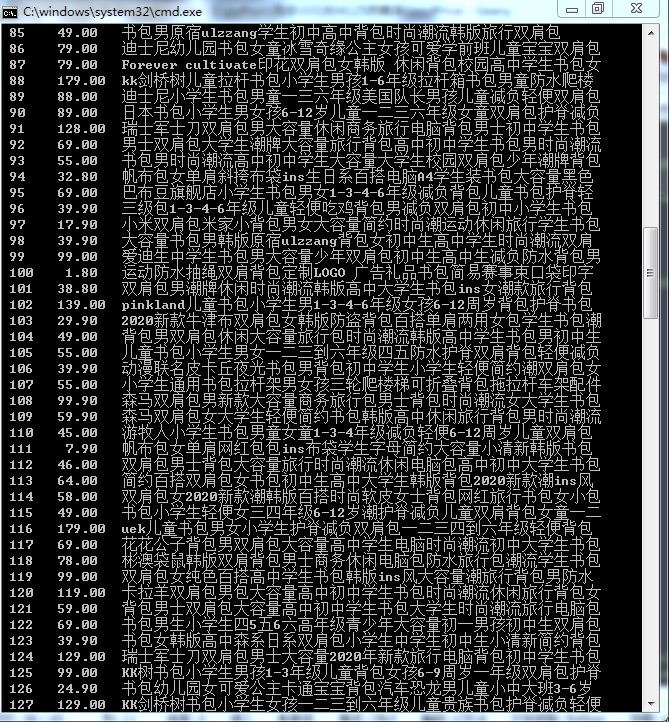 要求:用requests和re库方法设计某个商城(自已选择)商品比价定向爬虫,爬取该商城,以关键词“书包”搜索页面的数据,爬取商品名称和价格。
