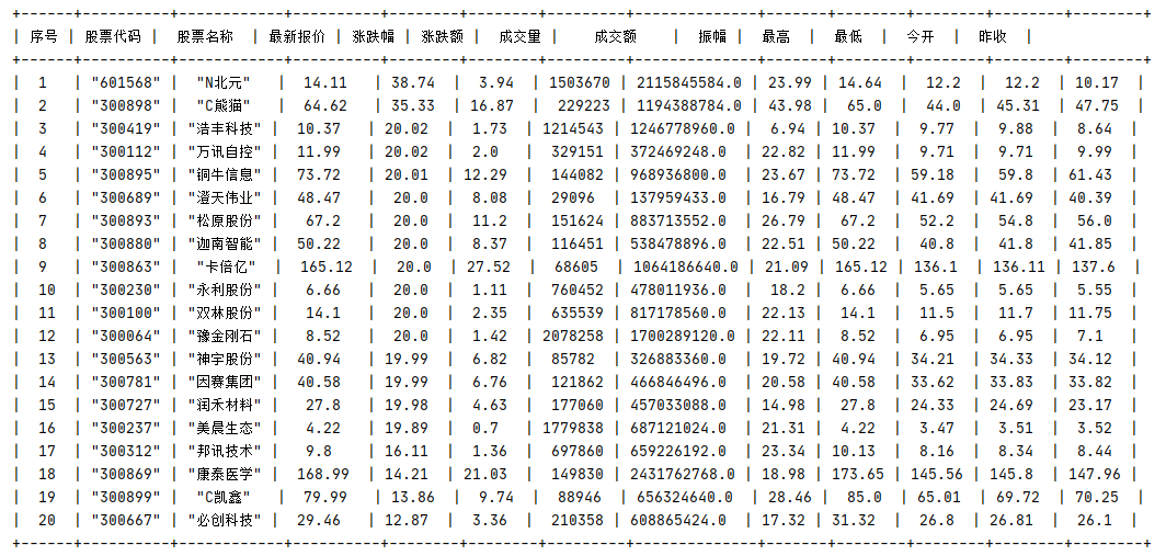 tb = pt.PrettyTable(["序号", "股票代码", "股票名称", "最新报价", "涨跌幅", "涨跌额", "成交量", "成交额", "振幅", "最高", "最低", "今开", "昨收"])