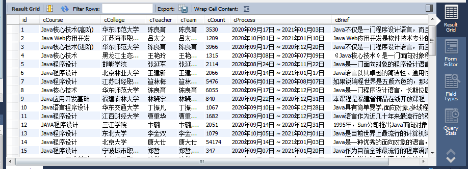 (id,cCourse,cCollege,cTeacher,cTeam,cCount,cProcess,cBrief))