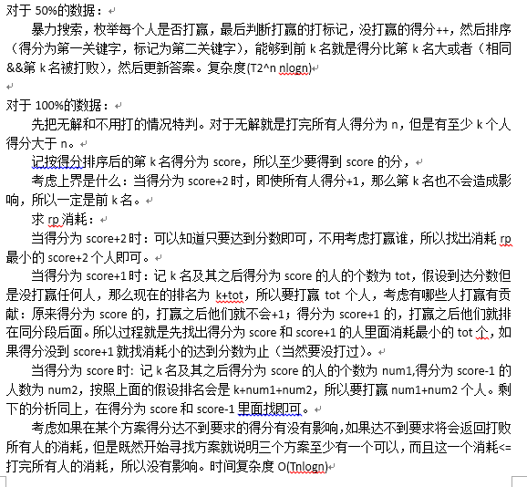 对于每一组数据,输出一个整数,表示最少需要花费的RP,如果无论如何也无法进入前 \(K\) 名,则输出 \(-1\)。