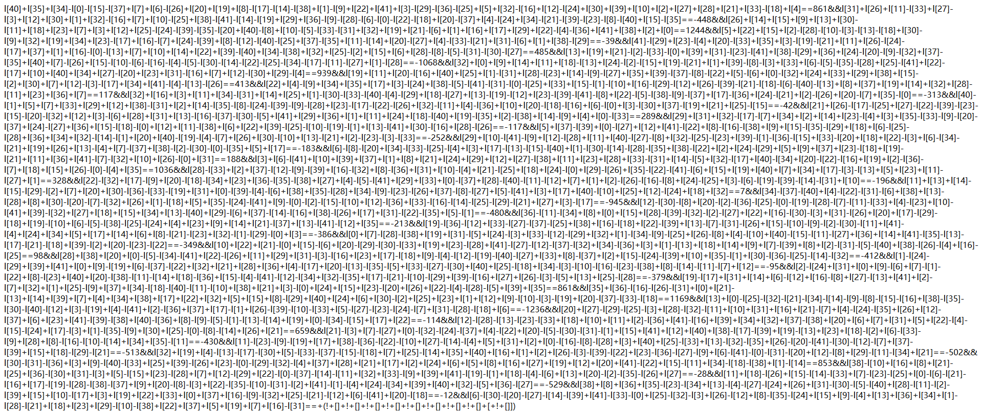 # -*- coding:utf-8 -*- from z3 import * l = [Int("l%d"%i) for i in range(0x2a)] s = Solver() for i in l: s.add(i>0) s.add(i<255) s.add(l[40]+l[35]+l[34]-l[0]-l[15]-l[37]+l[7]+l[6]-l[26]+l[20]+l[19]+l[8]-l[17]-l[14]-l[38]+l[1]-l[9]+l[22]+l[41]+l[3]-l[29]-l[36]-l[25]+l[5]+l[32]-l[16]+l[12]-l[24]+l[30]+l[39]+l[10]+l[2]+l[27]+l[28]+l[21]+l[33]-l[18]+l[4]==861) s.add(l[31]+l[26]+l[11]-l[33]+l[27]-l[3]+l[12]+l[30]+l[1]+l[32]-l[16]+l[7]+l[10]-l[25]+l[38]-l[41]-l[14]-l[19]+l[29]+l[36]-l[9]-l[28]-l[6]-l[0]-l[22]-l[18]+l[20]-l[37]+l[4]-l[24]+l[34]-l[21]-l[39]-l[23]-l[8]-l[40]+l[15]-l[35]==-448) s.add(l[26]+l[14]+l[15]+l[9]+l[13]+l[30]-l[11]+l[18]+l[23]+l[7]+l[3]+l[12]+l[25]-l[24]-l[39]-l[35]-l[20]+l[40]-l[8]+l[10]-l[5]-l[33]-l[31]+l[32]+l[19]+l[21]-l[6]+l[1]+l[16]+l[17]+l[29]+l[22]-l[4]-l[36]+l[41]+l[38]+l[2]+l[0]==1244) s.add(l[5]+l[22]+l[15]+l[2]-l[28]-l[10]-l[3]-l[13]-l[18]+l[30]-l[9]+l[32]+l[19]+l[34]+l[23]-l[17]+l[16]-l[7]+l[24]-l[39]+l[8]-l[12]-l[40]-l[25]+l[37]-l[35]+l[11]-l[14]+l[20]-l[27]+l[4]-l[33]-l[21]+l[31]-l[6]+l[1]+l[38]-l[29]==-39) s.add(l[41]-l[29]+l[23]-l[4]+l[20]-l[33]+l[35]+l[3]-l[19]-l[21]+l[11]+l[26]-l[24]-l[17]+l[37]+l[1]+l[16]-l[0]-l[13]+l[7]+l[10]+l[14]+l[22]+l[39]-l[40]+l[34]-l[38]+l[32]+l[25]-l[2]+l[15]+l[6]+l[28]-l[8]-l[5]-l[31]-l[30]-l[27]==485) s.add(l[13]+l[19]+l[21]-l[2]-l[33]-l[0]+l[39]+l[31]-l[23]-l[41]+l[38]-l[29]+l[36]+l[24]-l[20]-l[9]-l[32]+l[37]-l[35]+l[40]+l[7]-l[26]+l[15]-l[10]-l[6]-l[16]-l[4]-l[5]-l[30]-l[14]-l[22]-l[25]-l[34]-l[17]-l[11]-l[27]+l[1]-l[28]==-1068) s.add(l[32]+l[0]+l[9]+l[14]+l[11]+l[18]-l[13]+l[24]-l[2]-l[15]+l[19]-l[21]+l[1]+l[39]-l[8]-l[3]+l[33]+l[6]-l[5]-l[35]-l[28]+l[25]-l[41]+l[22]-l[17]+l[10]+l[40]+l[34]+l[27]-l[20]+l[23]+l[31]-l[16]+l[7]+l[12]-l[30]+l[29]-l[4]==939) s.add(l[19]+l[11]+l[20]-l[16]+l[40]+l[25]+l[1]-l[31]+l[28]-l[23]+l[14]-l[9]-l[27]+l[35]+l[39]-l[37]-l[8]-l[22]+l[5]-l[6]+l[0]-l[32]+l[24]+l[33]+l[29]+l[38]+l[15]-l[2]+l[30]+l[7]+l[12]-l[3]-l[17]+l[34]+l[41]-l[4]-l[13]-l[26]==413) s.add(l[22]+l[4]-l[9]+l[34]+l[35]+l[17]+l[3]-l[24]+l[38]-l[5]-l[41]-l[31]-l[0]-l[25]+l[33]+l[15]-l[1]-l[10]+l[16]-l[29]-l[12]+l[26]-l[39]-l[21]-l[18]-l[6]-l[40]-l[13]+l[8]+l[37]+l[19]+l[14]+l[32]+l[28]-l[11]+l[23]+l[36]+l[7]==117) s.add(l[32]+l[16]+l[3]+l[11]+l[34]-l[31]+l[14]+l[25]+l[1]-l[30]-l[33]-l[40]-l[4]-l[29]+l[18]-l[27]+l[13]-l[19]-l[12]+l[23]-l[39]-l[41]-l[8]+l[22]-l[5]-l[38]-l[9]-l[37]+l[17]-l[36]+l[24]-l[21]+l[2]-l[26]+l[20]-l[7]+l[35]-l[0]==-313) s.add(l[40]-l[1]+l[5]+l[7]+l[33]+l[29]+l[12]+l[38]-l[31]+l[2]+l[14]-l[35]-l[8]-l[24]-l[39]-l[9]-l[28]+l[23]-l[17]-l[22]-l[26]+l[32]-l[11]+l[4]-l[36]+l[10]+l[20]-l[18]-l[16]+l[6]-l[0]+l[3]-l[30]+l[37]-l[19]+l[21]+l[25]-l[15]==-42) s.add(l[21]+l[26]-l[17]-l[25]+l[27]-l[22]-l[39]-l[23]-l[15]-l[20]-l[32]+l[12]+l[3]-l[6]+l[28]+l[31]+l[13]-l[16]-l[37]-l[30]-l[5]+l[41]+l[29]+l[36]+l[1]+l[11]+l[24]+l[18]-l[40]+l[19]-l[35]+l[2]-l[38]+l[14]-l[9]+l[4]+l[0]-l[33]==289) s.add(l[29]+l[31]+l[32]-l[17]-l[7]+l[34]+l[2]+l[14]+l[23]-l[4]+l[3]+l[35]-l[33]-l[9]-l[20]-l[37]+l[24]-l[27]+l[36]+l[15]-l[18]-l[0]+l[12]+l[11]-l[38]+l[6]+l[22]+l[39]-l[25]-l[10]-l[19]-l[1]+l[13]-l[41]+l[30]-l[16]+l[28]-l[26]==-117) s.add(l[5]+l[37]-l[39]+l[0]-l[27]+l[12]+l[41]-l[22]+l[8]-l[16]-l[38]+l[9]+l[15]-l[35]-l[29]+l[18]+l[6]-l[25]-l[28]+l[36]+l[34]+l[32]-l[14]-l[1]+l[20]+l[40]-l[19]-l[4]-l[7]+l[26]+l[30]-l[10]+l[13]-l[21]+l[2]-l[23]-l[3]-l[33]==-252) s.add(l[29]+l[10]-l[41]-l[9]+l[12]-l[28]+l[11]+l[40]-l[27]-l[8]+l[32]-l[25]-l[23]+l[39]-l[1]-l[36]-l[15]+l[33]-l[20]+l[18]+l[22]-l[3]+l[6]-l[34]-l[21]+l[19]+l[26]+l[13]-l[4]+l[7]-l[37]+l[38]-l[2]-l[30]-l[0]-l[35]+l[5]+l[17]==-183) s.add(l[6]-l[8]-l[20]+l[34]-l[33]-l[25]-l[4]+l[3]+l[17]-l[13]-l[15]-l[40]+l[1]-l[30]-l[14]-l[28]-l[35]+l[38]-l[22]+l[2]+l[24]-l[29]+l[5]+l[9]+l[37]+l[23]-l[18]+l[19]-l[21]+l[11]+l[36]+l[41]-l[7]-l[32]+l[10]+l[26]-l[0]+l[31]==188) s.add(l[3]+l[6]-l[41]+l[10]+l[39]+l[37]+l[1]+l[8]+l[21]+l[24]+l[29]+l[12]+l[27]-l[38]+l[11]+l[23]+l[28]+l[33]-l[31]+l[14]-l[5]+l[32]-l[17]+l[40]-l[34]+l[20]-l[22]-l[16]+l[19]+l[2]-l[36]-l[7]+l[18]+l[15]+l[26]-l[0]-l[4]+l[35]==1036) s.add(l[28]-l[33]+l[2]+l[37]-l[12]-l[9]-l[39]+l[16]-l[32]+l[8]-l[36]+l[31]+l[10]-l[4]+l[21]-l[25]+l[18]+l[24]-l[0]+l[29]-l[26]+l[35]-l[22]-l[41]-l[6]+l[15]+l[19]+l[40]+l[7]+l[34]+l[17]-l[3]-l[13]+l[5]+l[23]+l[11]-l[27]+l[1]==328) s.add(l[22]-l[32]+l[17]-l[9]+l[20]-l[18]-l[34]+l[23]+l[36]-l[35]-l[38]+l[27]+l[4]-l[5]-l[41]+l[29]+l[33]+l[0]-l[37]+l[28]-l[40]-l[11]-l[12]+l[7]+l[1]+l[2]-l[26]-l[16]-l[8]+l[24]-l[25]+l[3]-l[6]-l[19]-l[39]-l[14]-l[31]+l[10]==-196) s.add(l[11]+l[13]+l[14]-l[15]-l[29]-l[2]+l[7]+l[20]+l[30]-l[36]-l[33]-l[19]+l[31]+l[0]-l[39]-l[4]-l[6]+l[38]+l[35]-l[28]+l[34]-l[9]-l[23]-l[26]+l[37]-l[8]-l[27]+l[5]-l[41]+l[3]+l[17]+l[40]-l[10]+l[25]+l[12]-l[24]+l[18]+l[32]==7) s.add(l[34]-l[37]-l[40]+l[4]-l[22]-l[31]-l[6]+l[38]+l[13]-l[28]+l[8]+l[30]-l[20]-l[7]-l[32]+l[26]+l[1]-l[18]+l[5]+l[35]-l[24]-l[41]+l[9]-l[0]-l[2]-l[15]-l[10]+l[12]-l[36]+l[33]-l[16]-l[14]-l[25]-l[29]-l[21]+l[27]+l[3]-l[17]==-945) s.add(l[12]-l[30]-l[8]+l[20]-l[2]-l[36]-l[25]-l[0]-l[19]-l[28]-l[7]-l[11]-l[33]+l[4]-l[23]+l[10]-l[41]+l[39]-l[32]+l[27]+l[18]+l[15]+l[34]+l[13]-l[40]+l[29]-l[6]+l[37]-l[14]-l[16]+l[38]-l[26]+l[17]+l[31]-l[22]-l[35]+l[5]-l[1]==-480) s.add(l[36]-l[11]-l[34]+l[8]+l[0]+l[15]+l[28]-l[39]-l[32]-l[2]-l[27]+l[22]+l[16]-l[30]-l[3]+l[31]-l[26]+l[20]+l[17]-l[29]-l[18]+l[19]-l[10]+l[6]-l[5]-l[38]-l[25]-l[24]+l[4]+l[23]+l[9]+l[14]+l[21]-l[37]+l[13]-l[41]-l[12]+l[35]==-213) s.add(l[19]-l[36]-l[12]+l[33]-l[27]-l[37]-l[25]+l[38]+l[16]-l[18]+l[22]-l[39]+l[13]-l[7]-l[31]-l[26]+l[15]-l[10]-l[9]-l[2]-l[30]-l[11]+l[41]-l[4]+l[24]+l[34]+l[5]+l[17]+l[14]+l[6]+l[8]-l[21]-l[23]+l[32]-l[1]-l[29]-l[0]+l[3]==-386) s.add(l[0]+l[7]-l[28]-l[38]+l[19]+l[31]-l[5]+l[24]-l[3]+l[33]-l[12]-l[29]+l[32]+l[1]-l[34]-l[9]-l[25]+l[26]-l[8]+l[4]-l[10]+l[40]-l[15]-l[11]-l[27]+l[36]+l[14]+l[41]-l[35]-l[13]-l[17]-l[21]-l[18]+l[39]-l[2]+l[20]-l[23]-l[22]==-349) s.add(l[10]+l[22]+l[21]-l[0]+l[15]-l[6]+l[20]-l[29]-l[30]-l[33]+l[19]+l[23]-l[28]+l[41]-l